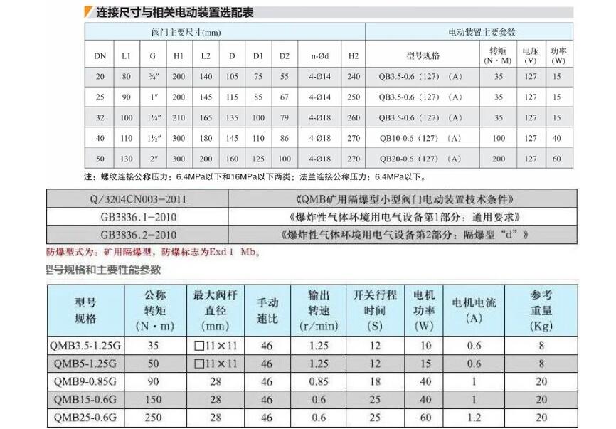 上海湖泉閥門(mén)集團(tuán)有限公司礦用小口徑電動(dòng)球閥是一種由球體旋轉(zhuǎn)而開(kāi)閉水路的新型礦用隔爆型電動(dòng)球閥(以下簡(jiǎn)稱(chēng)電動(dòng)球閥),由于其適應(yīng)的供水壓力范圍廣、不受泥沙、污水影響、供水通徑大、工作過(guò)程中通電時(shí)間短、工作穩(wěn)定可靠、是一種代用電磁閥的理想替代產(chǎn)品。 防爆型式:隔爆型;防爆標(biāo)志:ExdⅠ,是一種由球體旋轉(zhuǎn)而開(kāi)閉水路的新型礦用隔爆型電動(dòng)球閥(以下簡(jiǎn)稱(chēng)電動(dòng)球閥),由于其適應(yīng)的供水壓力范圍廣、不受泥沙、污水影響、供水通徑大、工作過(guò)程中通電時(shí)間短、工作穩(wěn)定可靠、是一種代用電磁閥的理想替代產(chǎn)品。 防爆型式:隔爆型;防爆標(biāo)志:ExdⅠ。 執(zhí)行標(biāo)準(zhǔn):Q/ZLH07-2008、MT/715-1997標(biāo)準(zhǔn)。 正常工作條件: 電動(dòng)閥應(yīng)在下列條件下可靠的工作: 海拔高度不超過(guò)2000m; 環(huán)境大氣壓80-110kPa; 環(huán)境溫度-20-+40℃; 周?chē)諝庀鄬?duì)濕度不大于95%(25℃時(shí)); 具有甲烷混合物及煤塵爆炸危險(xiǎn)的煤礦井下; 在無(wú)顯著振動(dòng)的地方; 在無(wú)破壞金屬絕緣的氣體和蒸氣的環(huán)境; 在無(wú)滴水的地方。是一種由球體旋轉(zhuǎn)而開(kāi)閉水路的新型電動(dòng)閥門(mén),它由數(shù)字邏輯控制電路,方向控制電路,電流采樣控制電路,工作狀態(tài)指示電路等組成;接入24VDC電源后,控制端K1、K2有繼電器無(wú)源點(diǎn)控制球閥的開(kāi)啟與關(guān)閉,K1與K2短接球閥打開(kāi),K1與K2斷開(kāi)球閥關(guān)閉。由電流采樣控制電路檢測(cè)球閥的工作位置, 工作狀態(tài)指示電路指示球閥的工作狀態(tài): 球閥旋轉(zhuǎn)開(kāi)啟,綠色LED亮;當(dāng)開(kāi)啟到設(shè)定口徑時(shí),黃燈亮(此時(shí)電機(jī)不耗電);當(dāng)球閥旋轉(zhuǎn)關(guān)閉時(shí),紅燈亮(此時(shí)電機(jī)不耗電)。 四.主要技術(shù)參數(shù) 1. 防爆標(biāo)志: ExdⅠ 2. 輸入電壓: 24V DC. 3. 工作電流: ≤70mA DC. 4. 環(huán)境溫度: 0℃~40℃ 5. 環(huán)境濕度: ≤95%RH.(25℃時(shí)) 6. 大氣壓力: 80~110kPa 7. 水壓適應(yīng)范圍 : 0.2MPa~7.0MPa。 8. 水溫適應(yīng)范圍 : 0~60℃ 9. 球閥開(kāi)啟速度 : 6s~12s 10。