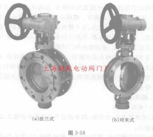 蝶閥根據(jù)連接方式分為:法蘭式、對夾式,如圖3—58(a)和(b)所示;根據(jù)密封面材料分為:軟密封、硬密封;根據(jù)蝶板在閥體中的安裝方式,蝶閥可分成:板式、斜板式、偏置板式、杠桿式。如圖3-59所示。